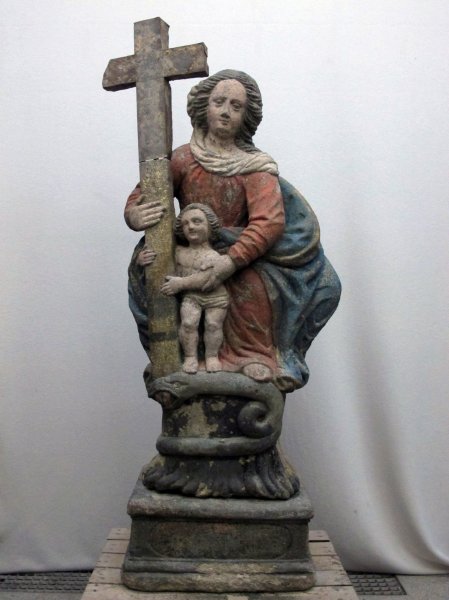 Socha Panny Marie s bolestným Jezulátkem po restaurováníRestauroval Pavel Roleček, Fakulta restaurátorských technik Univerzity Pardubice, 2014.